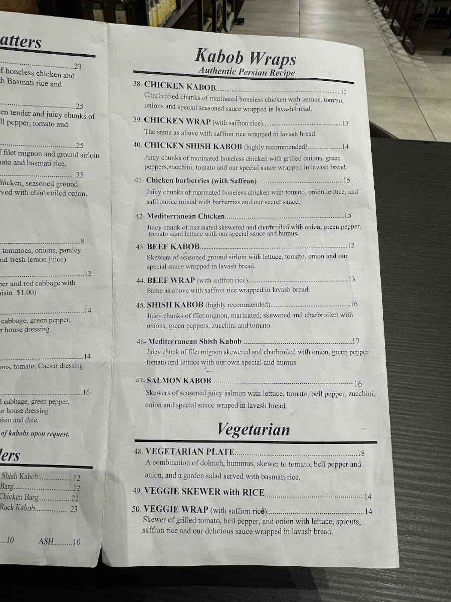 Skewered of seasoned ground sirloin with lettuce, tomato, onion, and our special sauce wrapped in lavash bread.