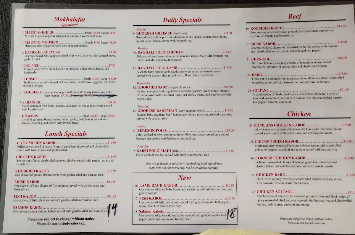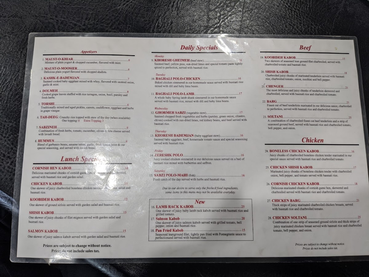 The menu boasts an array of delectable options that cater to every palate. Start with enticing appetizers like Kashke Bademjan—a savory sautéed eggplant dish—or try the crispy Dolmeh, filled with fresh herbs and spices. For the main event, indulge in standout kabobs, featuring the Cornish Chicken Kabob and the mouthwatering Shah Kabab, grilled to perfection.